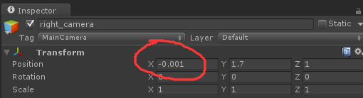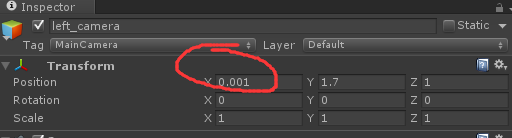 1.       在場景裏放置兩個攝像機分別設(shè)置為left_camera right_camera並把這兩個相機的X軸偏移一定的距離,一(yī)般為0.06-0.10 具體視情況(kuàng)設置,這個距離是表示兩眼(yǎn)的視差距離,太(tài)小了會導(dǎo)致(zhì)立體不(bú)明顯, 太大會導致無法聚焦,或者對眼,眼睛會酸脹。當目標離相機比較近時,這個(gè)值要求也比較小, 例如本例中設置了0.001。